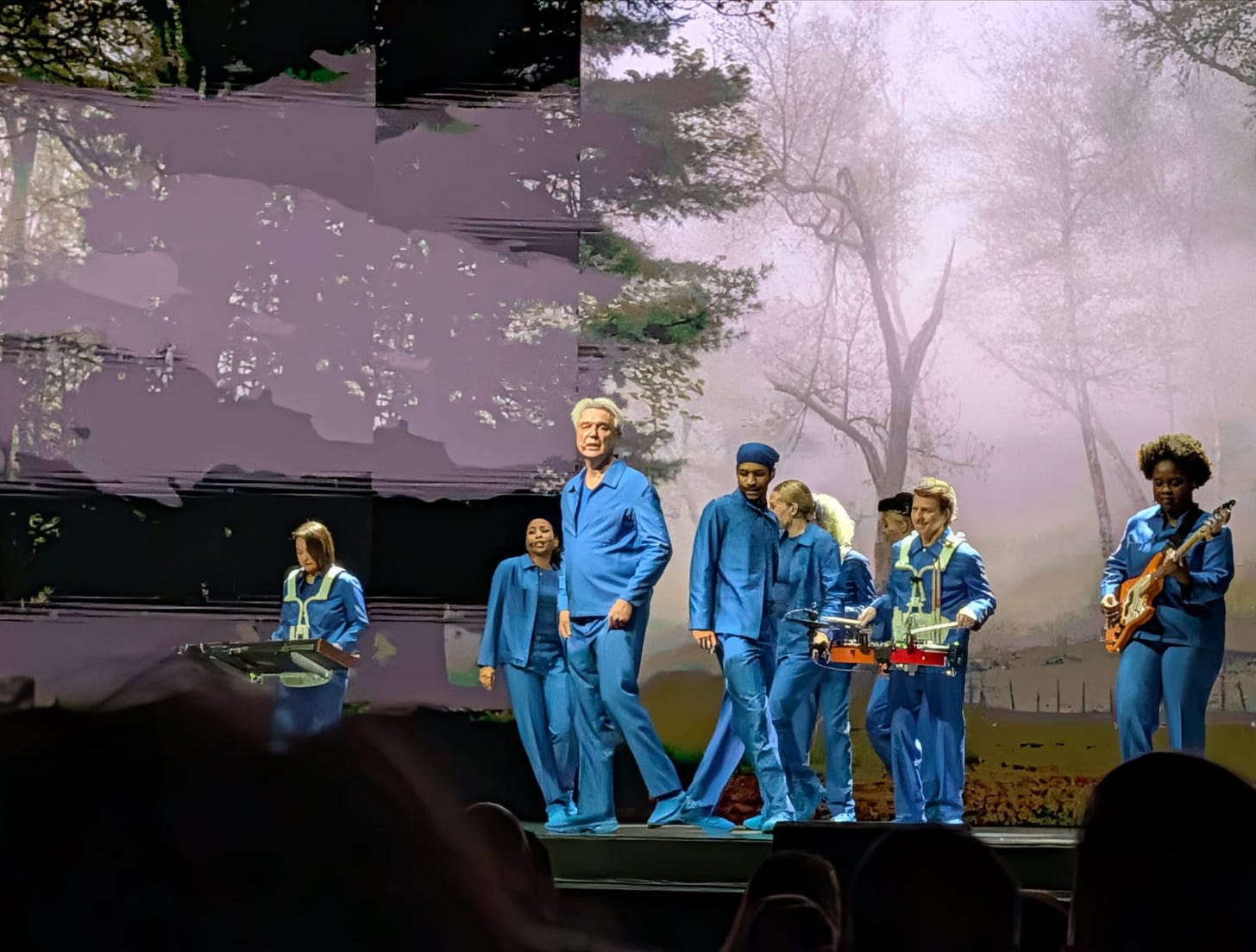 David is a talented musician. He is also a creative performer. He stood central stage at parts and held the audience in his hands. He also moved to the side of the stage at other moments to allow his ‘colleagues’ to show their talents. All the ensemble wore identical bright blue suits and he introduced their diverse backgrounds. The performers carried their own instruments. Not just the guitars and the saxophones, but also the keyboards and drums. The team were multi skilled. They sang, danced & played instruments. All carried their own weight. A simple and yet powerful back drop showed moving images that captured you in moments that were a ‘continual source of wonder’.
